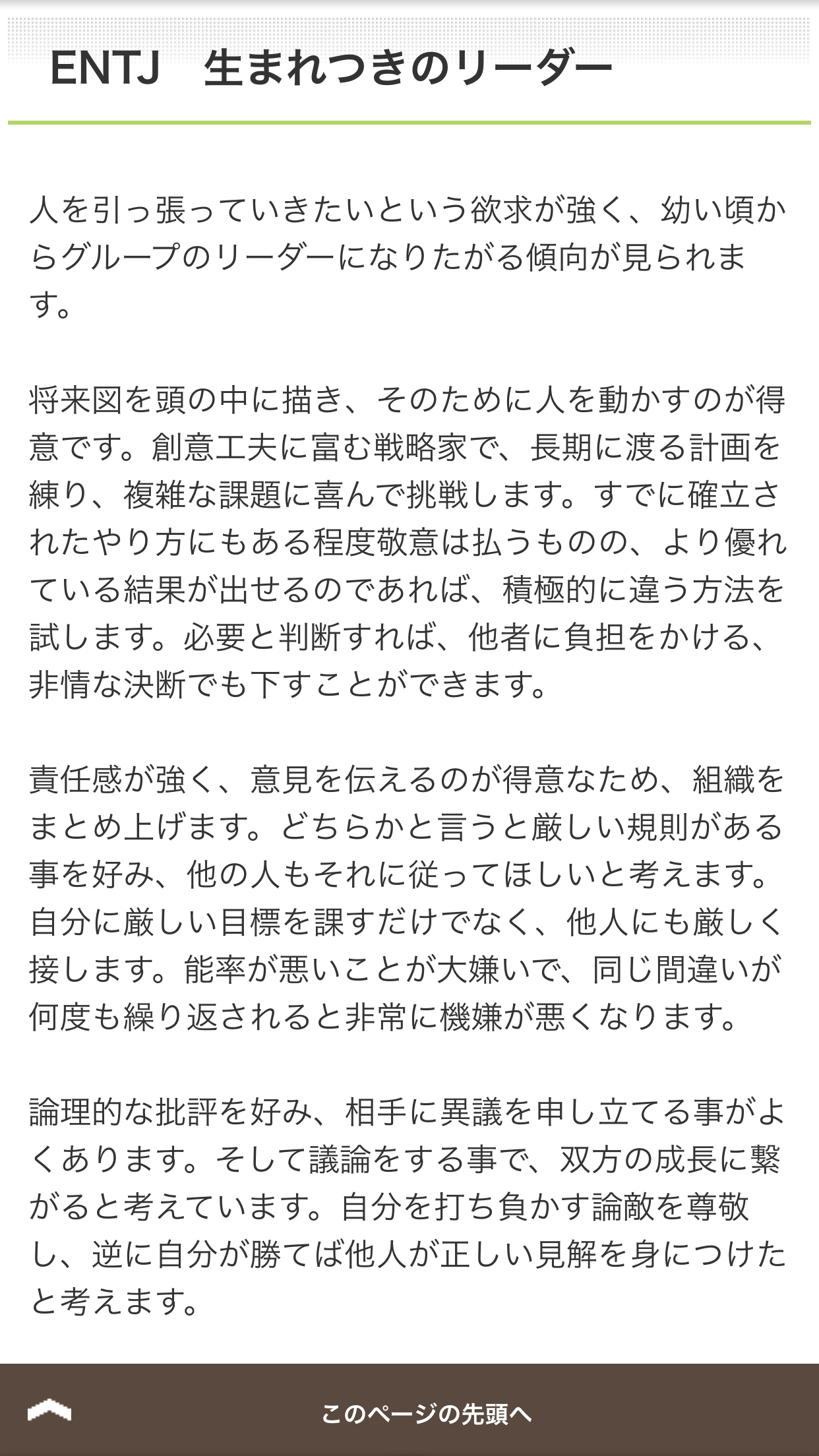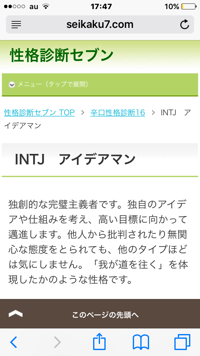 最初のがISTJ(一人コツコツ努力する人)で、次のはISTJ-T(管理者)って出たわ。
