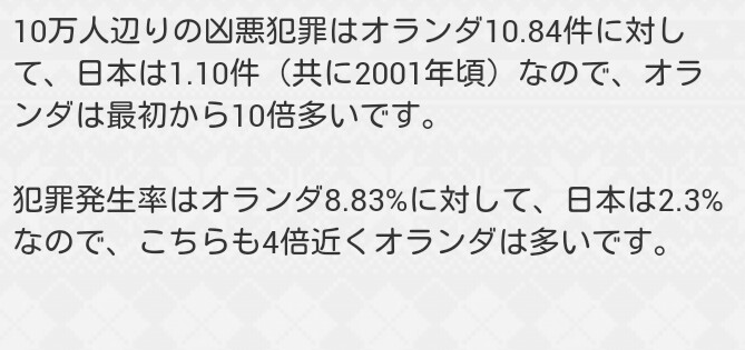 オランダ人に「オランダの学校でもいじめってあるんですか?」と聞いたら「いじめってなんですか」って言われた。「なぐったり…」「それは犯罪です。」「ものをとったり隠したり…」「それは犯罪です。」「集団で圧力を…」「不当ならば犯罪です。」そうだよねごめんジャパンが悪かった。