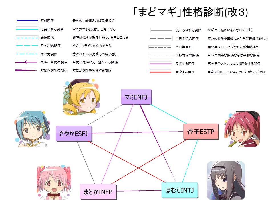 巴マミ(ENFJ)と佐倉杏子(ESTP)、巴マミと美樹さやか(ESFJ)の師弟関係がTDSで描かれています。