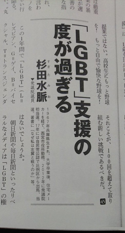 杉田議員、あなたの仰る通り新潮45を購入して寄稿を読ませていただきました。地方自治体のパートナーシップ制度は全て正式な手続きを踏んで制度化されています。それに税金が使われて何が問題でしょうか?