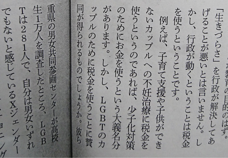 「子育て支援や子供ができないカップルへの不妊治療に税金を使うというのであれば、少子化対策のためにお金を使うという大義名分があります。しかし、LGBTのカップルのために税金を使うことに賛同が得られるものでしょうか。彼ら彼女らは子供を作らない、つまり『生産性』がないのです」