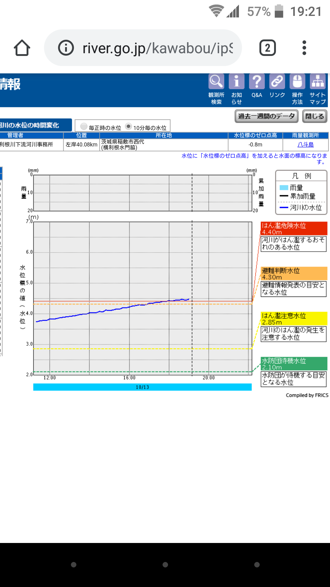 【警戒レベル4相当情報[洪水]】利根川下流部では、氾濫危険水位に到達し、氾濫のおそれあり