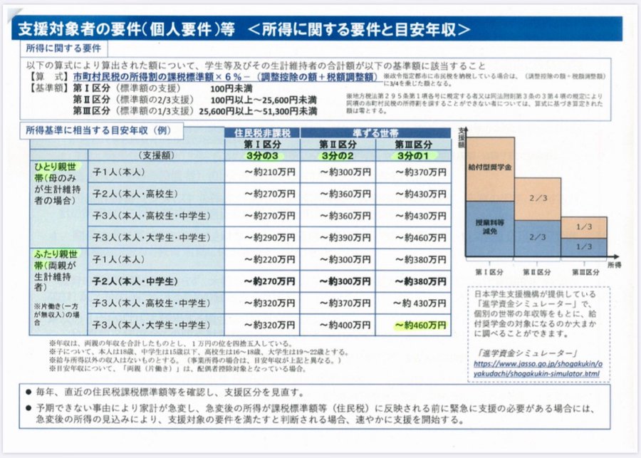 ・授業料免除や、返済の必要ない奨学金(最大91万円)の家計急変要件に、コロナを加えました。世帯所得460万円までもカバーしてるので、是非もう一度大学の窓口とご相談下さい pic.twitter.com/1tfQPMDSCP
