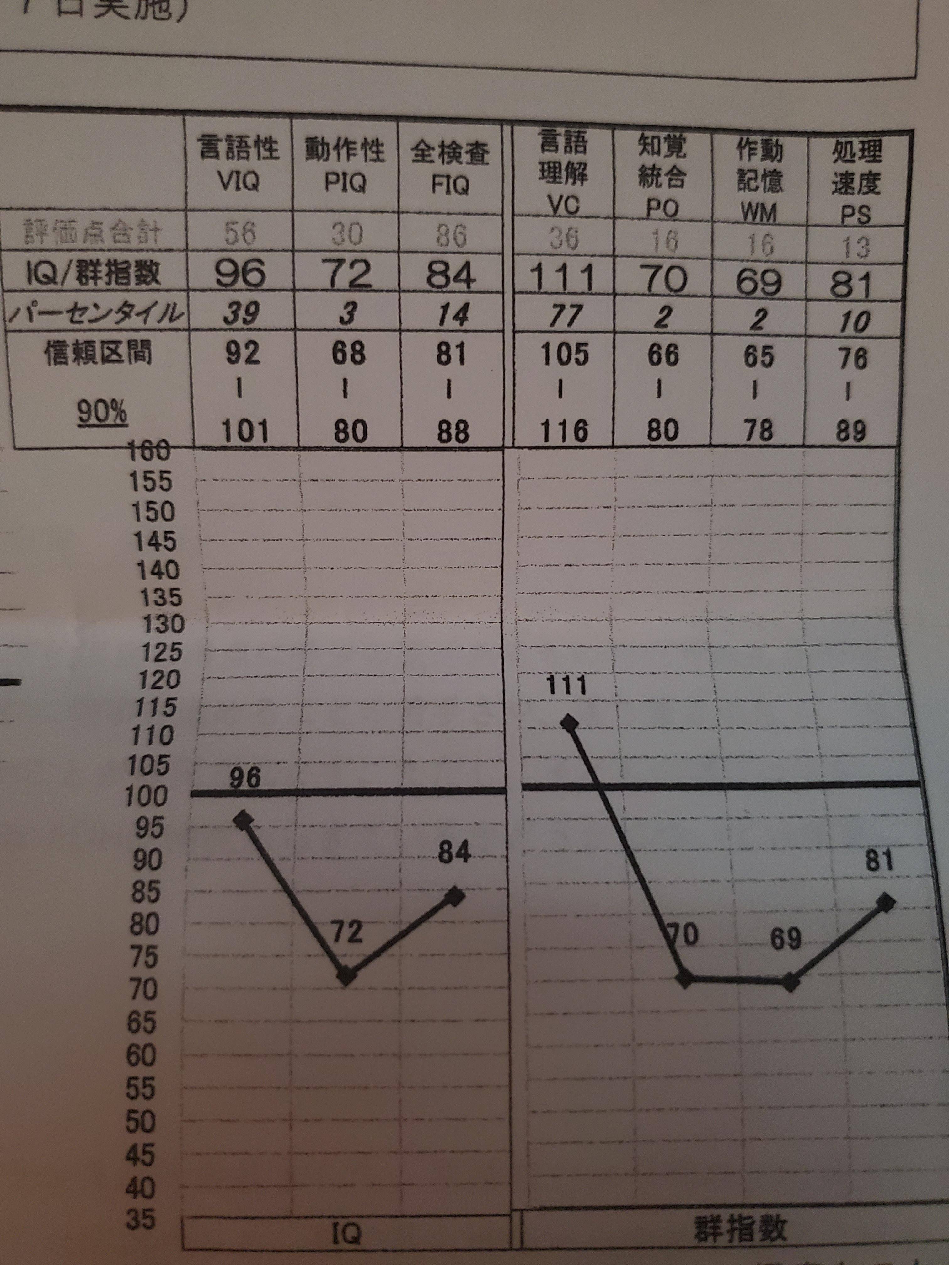 でも言語理解は比較的保たれていて、次点が知覚統合、作業記憶と処理速度が低く、平均的には85~95っていう感じがする