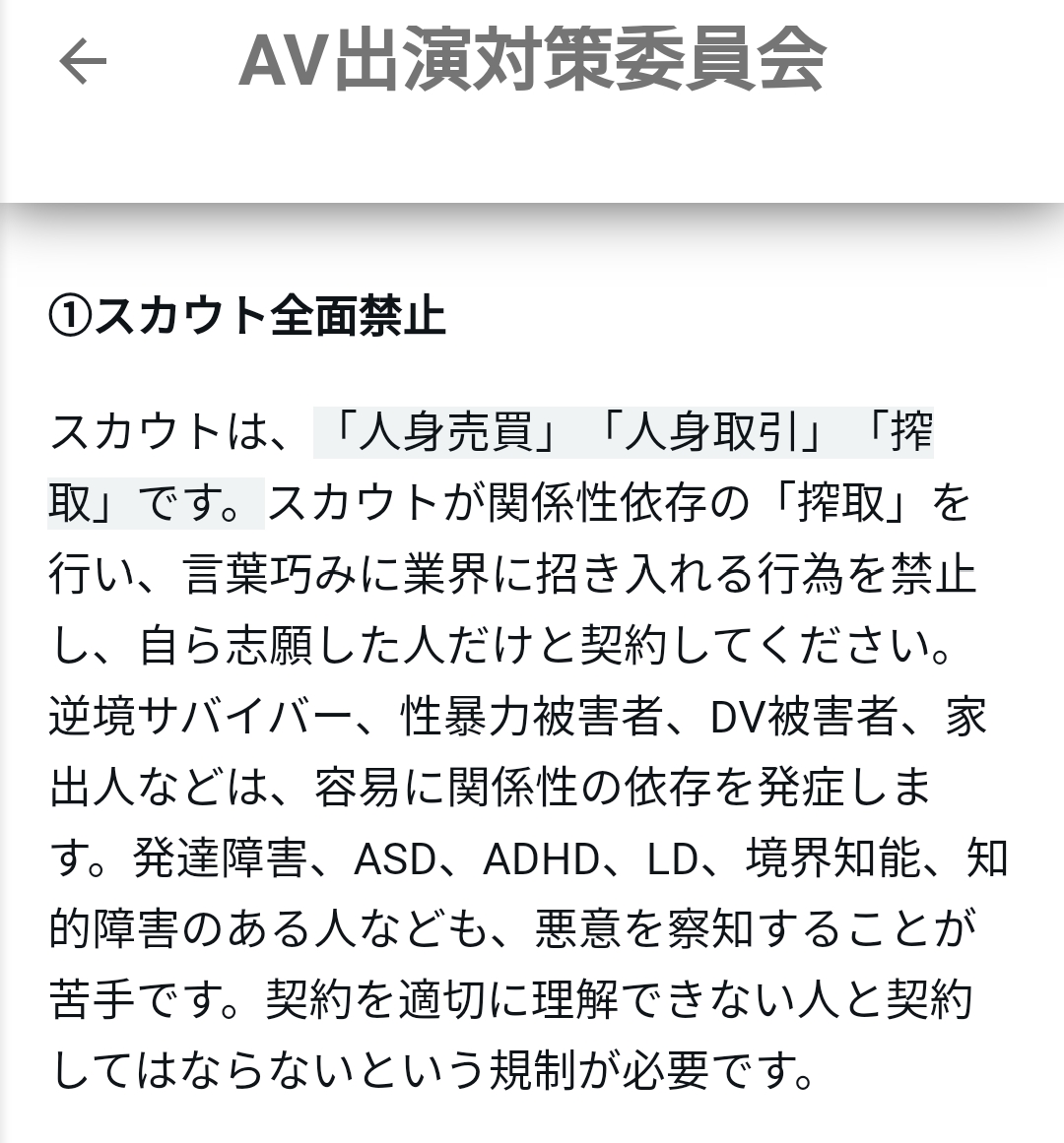 スカウトは、「人身売買」「人身取引」「搾取」です。スカウトが関係性依存の「搾取」を行い、言葉巧みに業界に招き入れる行為を禁止し、自ら志願した人だけと契約してください。 逆境サバイバー、性暴力被害者、DV被害者、家出人などは、容易に関係性の依存を発症します。発達障害、ASD、ADHD、LD、境界知能、知的障害のある人なども、悪意を察知することが苦手です。契約を適切に理解できない人と契約してはならないという規制が必要です。
