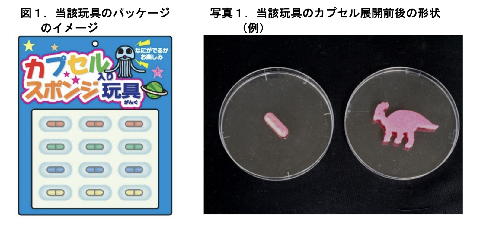 ・当該玩具で子どもが遊ぶ際には、カプセルの個数と出てきたスポンジの個数が同じであるか大人が確認しましょう。