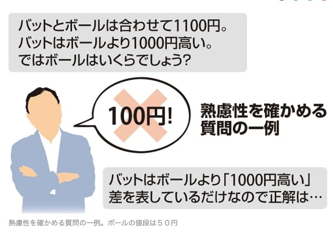 バットとボールはバット1000円ボール100円、て答えそうになった