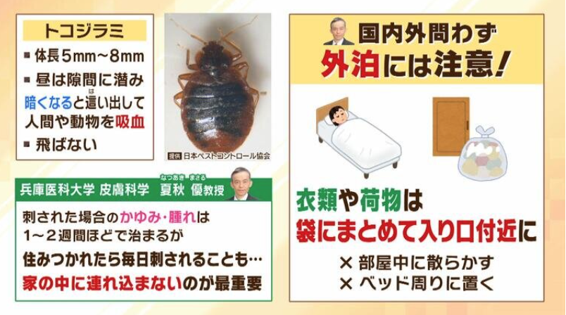 兵庫医科大学の夏秋優教授は「刺された場合のかゆみや腫れは1~2週間ほどでおさまるが、住みつかれたら毎日刺されることもある。家の中に連れ込まないのが最重要」と話します。そして、国内外問わず外泊には注意ということです。トコジラミは「飛ばない」という特性があり、活動は夜間であることから、連れて帰ってしまうのはどこかに泊まって服や荷物に付着した場合が多いそうです。