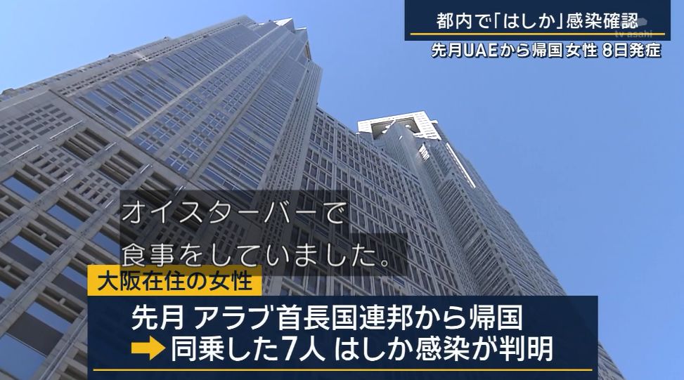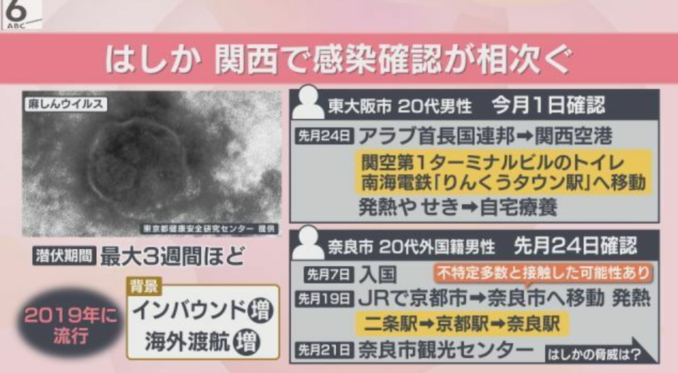 はしかへの感染が確認されたのは、大阪市内在住の20代の女性で、先月24日にアラブ首長国連邦から関西国際空港に向かう飛行機で日本に到着したということです。