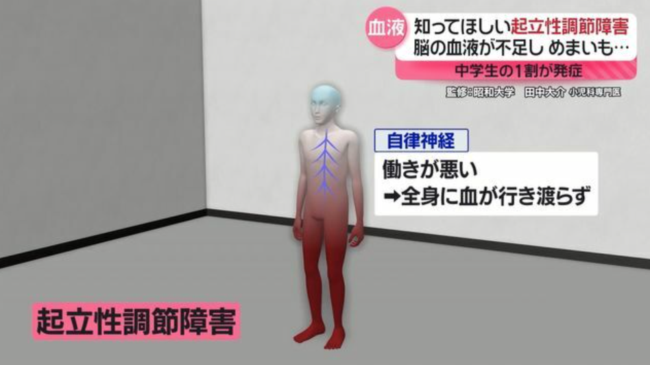 本来、私たちは、仰向けの状態から起き上がると、一時的に、血液は下半身にたまりますが、健康な人は自律神経が働くため、下半身の血管が収縮し、すぐに全身に血が行き渡ります。