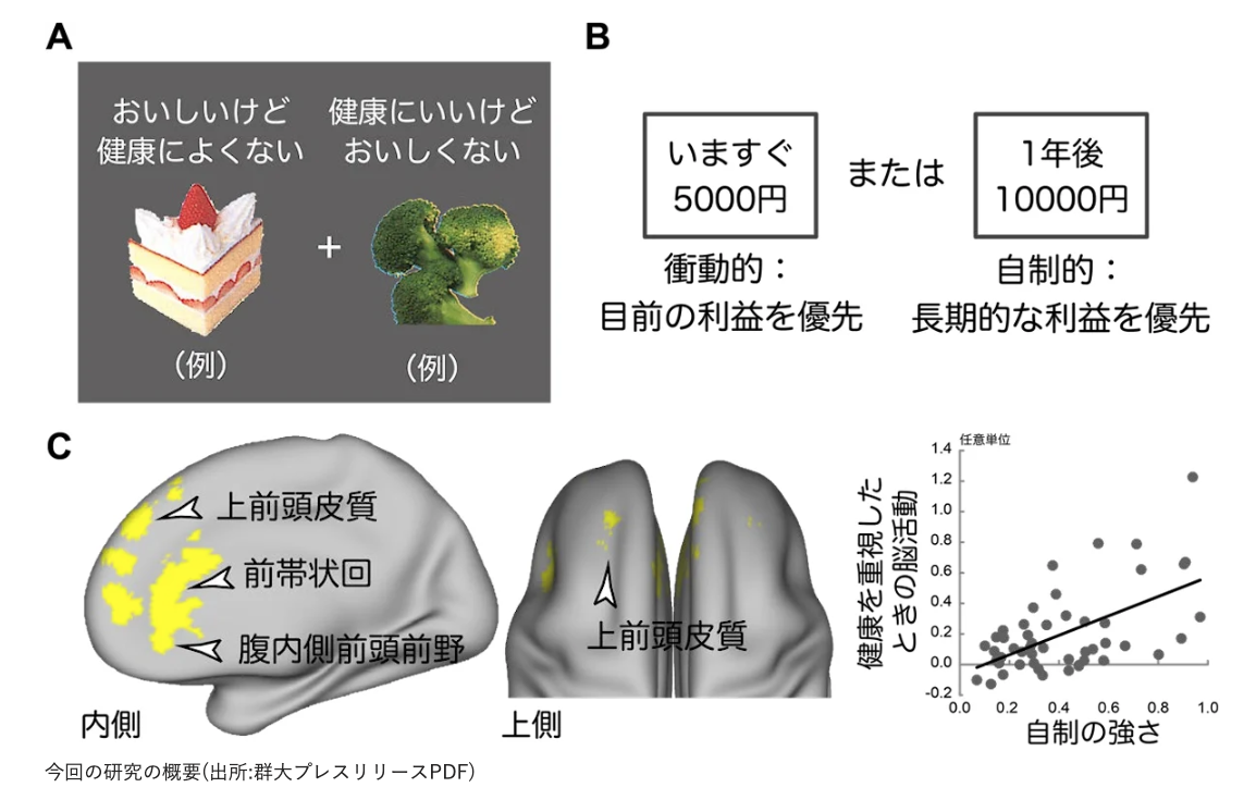 群馬大学(群大)、生理学研究所(生理研)、アラヤ、同志社大学の4者は7月30日、ヒトが「健康にいいけれどもおいしくない食べ物」を選ぶ時に前頭前野が活動し、その活動は長期的な利益を最大にする自制心の強いヒトほど大きくなることを発見したと共同で発表した。