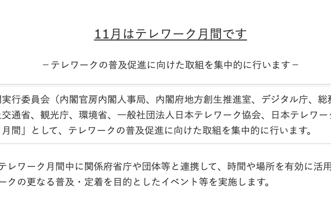 テレワーク月間実行委員会(内閣官房内閣人事局、内閣府地方創生推進室、デジタル庁、総務省、厚生労働省、経済産業省、国土交通省、観光庁、環境省、一般社団法人日本テレワーク協会、日本テレワーク学会)では、11月を「テレワーク月間」として、テレワークの普及促進に向けた取組を集中的に行います。