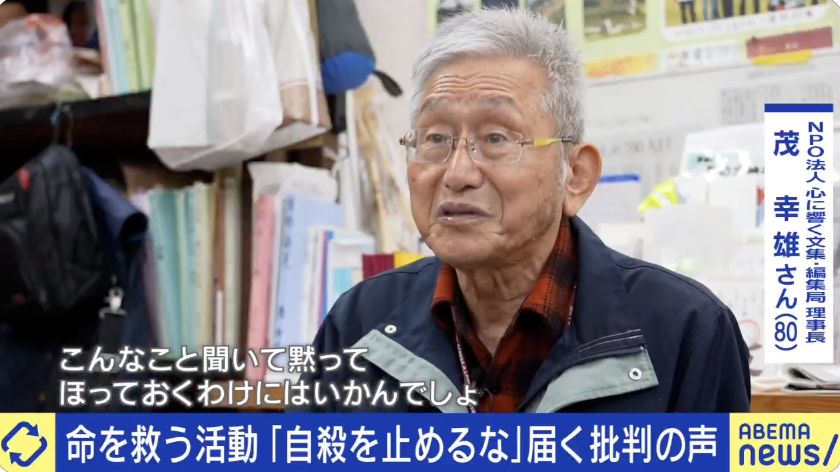 活動に対し「死ぬ権利を奪うな」など、直接批判の声が届くという。男性は「誰一人として本当に死にたいと言う人はいなかった」といい、その後の生活まで支援する覚悟が必要だと考えている。 pic.twitter.com/FyBNfzcRoR