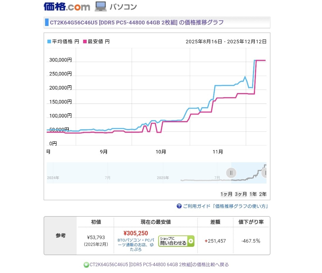 DDR5の64GB*2を9月に4.7万円で買ったけどもこれが『異常な安値』だった