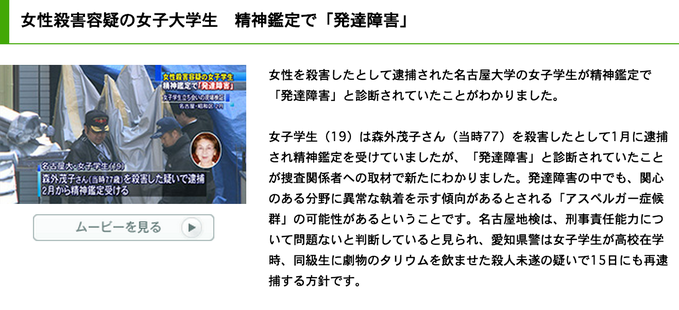 名古屋女性殺害事件の毒物オタ女子大生、「発達障害」と診断されていた事が判明。アスペが益々生き辛くなるな…